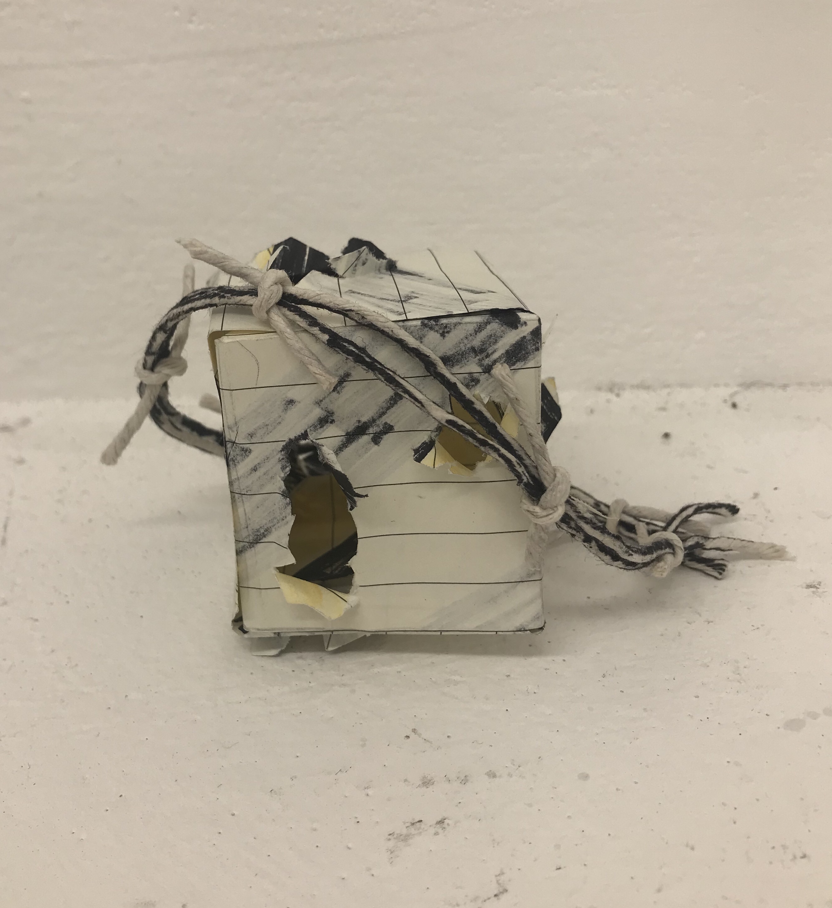 I experimented making nets to create a cube out of paper, I wanted to keep the cube white to create the feeling of hope and innocence, just like Savage looking after the bees during that time creates a sense of hope and add a bit of light to the world. I experiment colouring the inside of the cube black and yellow like the bees and ripping holes in the cube so the colours would shine through however I thought it was a bit too literal to the bee theme so chose to just make the inside of the cube bright yellow. I explored cutting holes out of the cube or wrapping holes or just leaving it complete, I thought it would look interesting to cut cube and rectangles out of the cube to shower a yellow core.