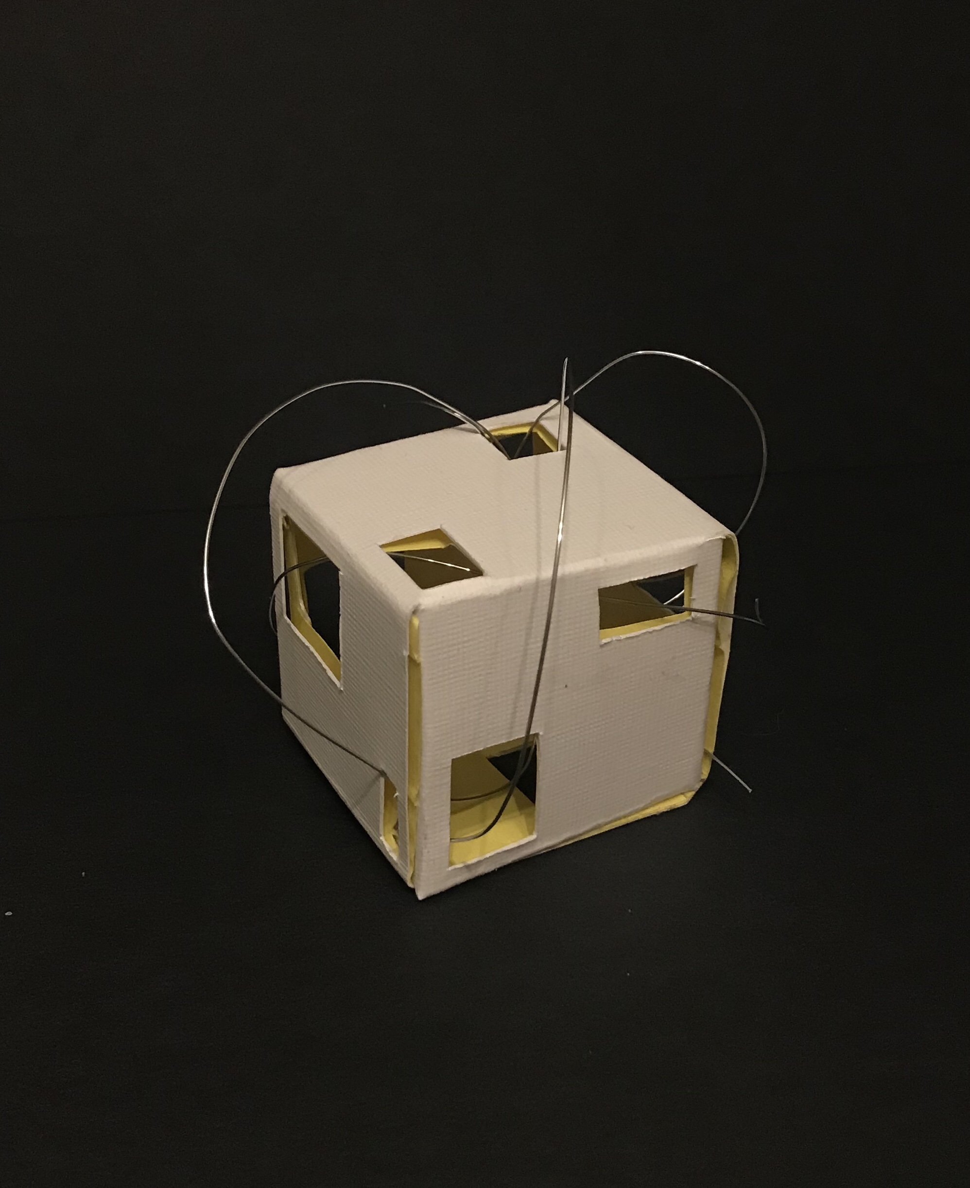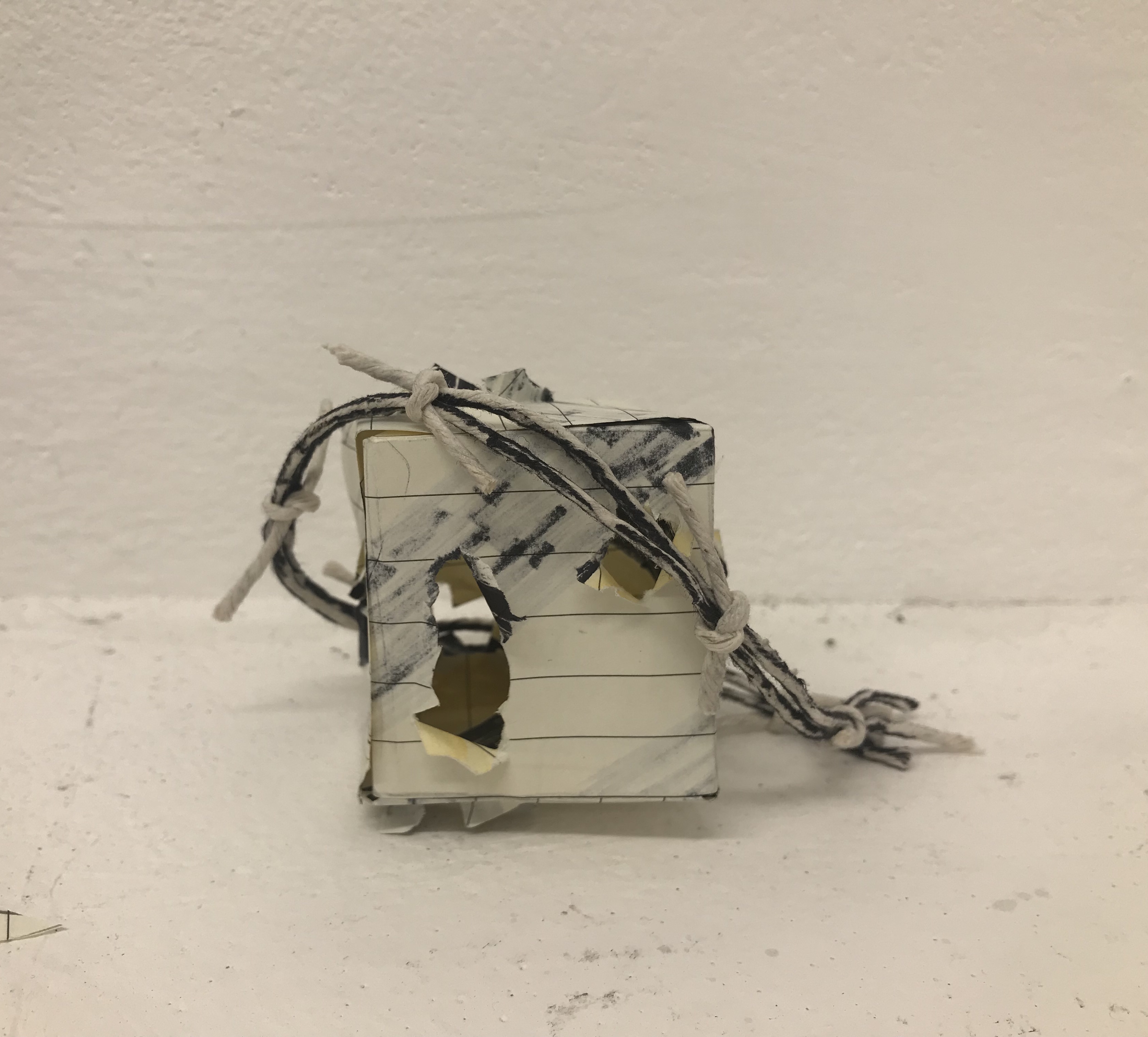 I had to think about how I wanted to incorporate the wire into the sculpture, I tried just wrapping it around or intertwining the wire through the cut-out shapes. I think the intertwined wire worked much better as it makes the piece look more connected and one piece. I think lopping the wire through the holes works very well as it links to the theme of protection, as the danger (the wire) is protecting the purity and hope (the white box) which is what I wanted to show through my work. I also think the combination of sharp edges in the cube and curved edges in the wire are visually interesting and leads your eyes around the sculpture.