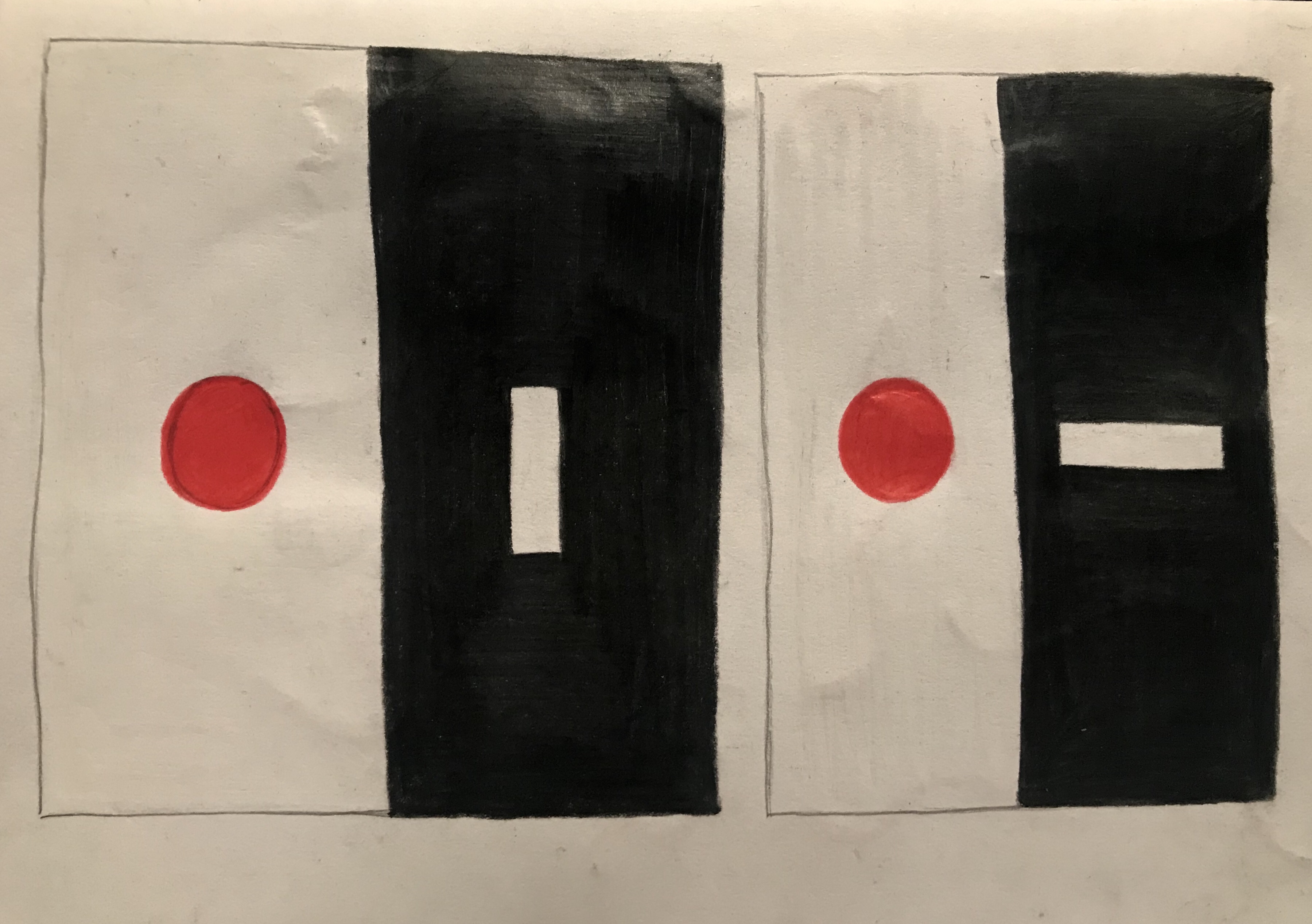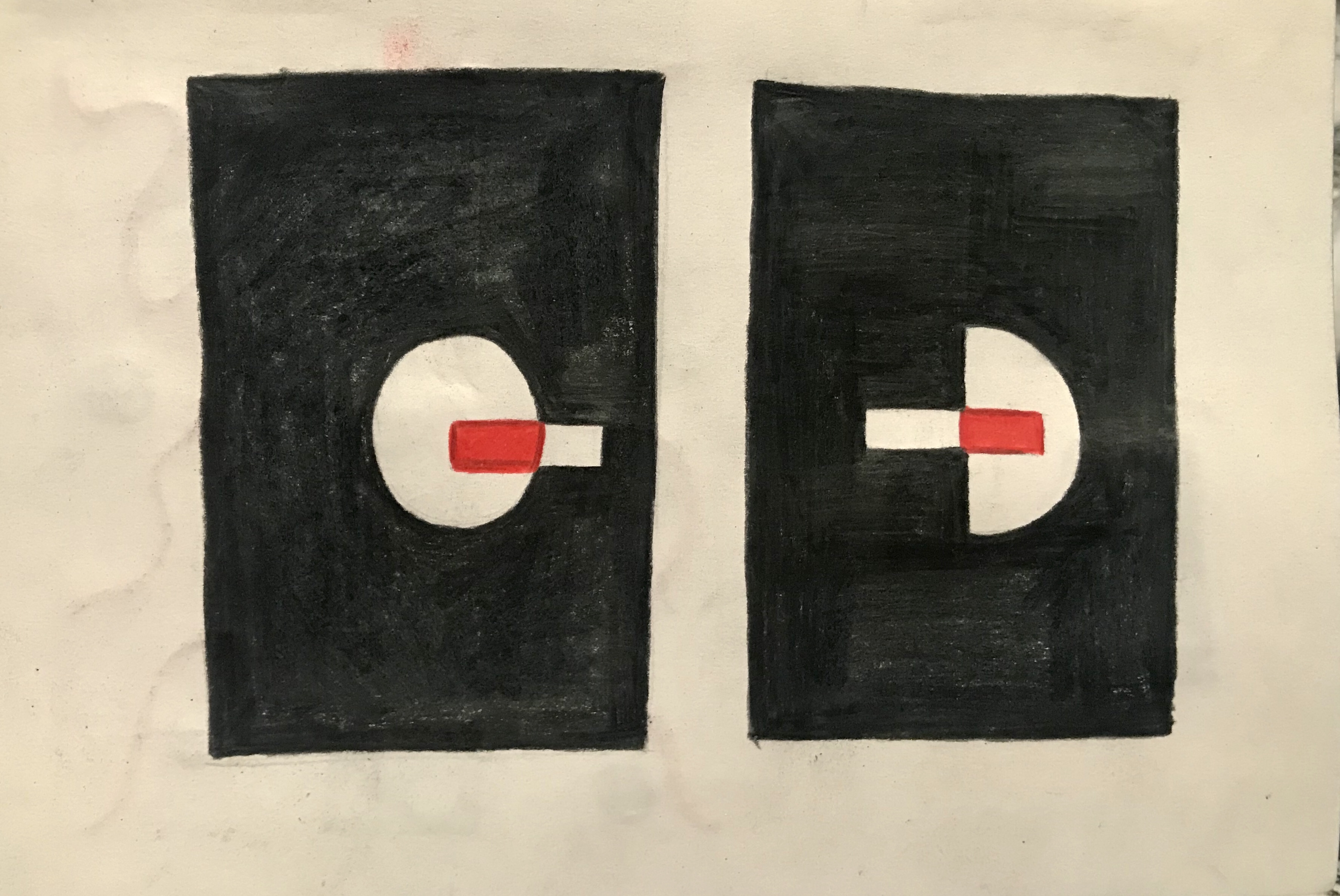 In reflection to the article I wanted to show a lot of division and opposite in my work. I chose to use a very limited selection of shapes only focusing on circles and rectangles. I wanted to symbolise the man and women using shape. I chose to work with only two shapes to also symbolise how closed-minded people are and how restricted they are when thinking about others and how their actions effect people. I wanted the two shapes to clash, the circle is rounded and smooth whereas the rectangle is sharp and linear. The shapes create a strong contrast next to each other. I really like the way the shapes fight against each other; it links to the article as the two side of the argument strongly disagree and how their opinions clash. I wanted the colour scheme to be bold and eye catching in my work, I chose to only use red, white and black. The drawings are almost monochromatic with the harsh burst of red which really stands out but also helps the shapes pop.